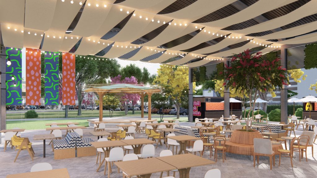 O ambiente, amplo e gratuito, traz um lindo projeto de paisagismo e praça ao ar livre, com área para piquenique, ideal para reunir as famílias e amigos. O lugar conta com operações das marcas: Bar Fora do Eixo, Flat Iron, Tio Gu Creperia, Dog da Igrejinha, Fosters Burger e Oxii Comida da Bahia.