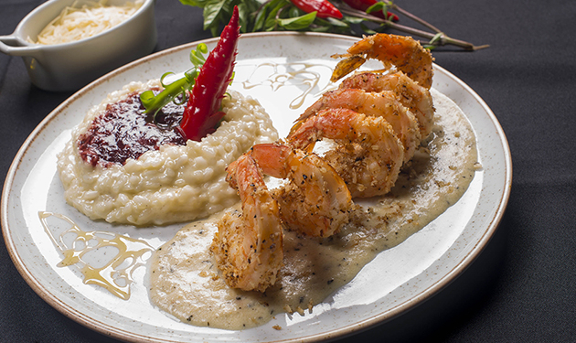 (Camarão Rosa na crosta de coco e castanha baru ao molho de queijo emmental regado de mel do campo com risoto de frutas vermelhas)