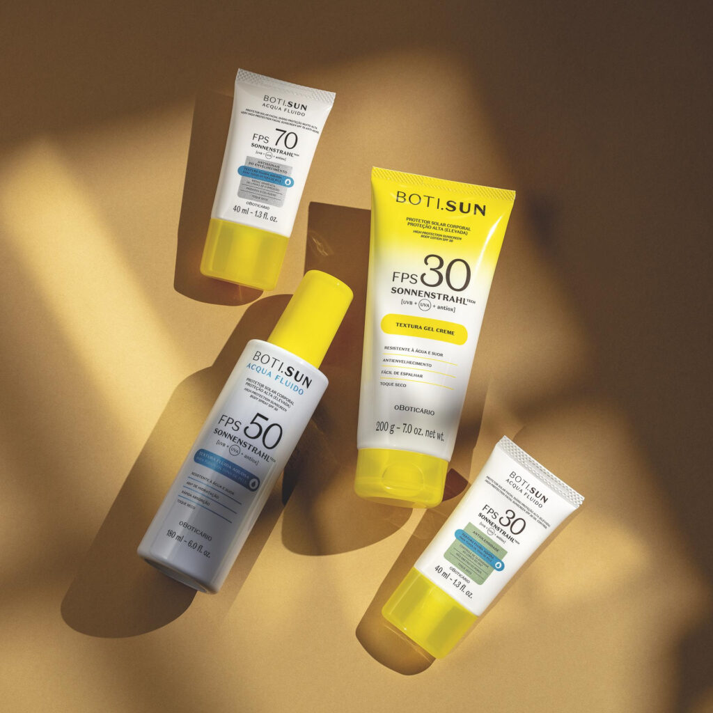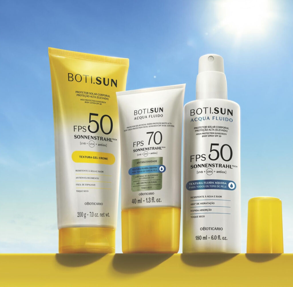 O lançamento de uma marca exclusiva dedicada à proteção solar vem também como resposta às principais dores dos consumidores no que diz respeito ao produto. Por isso, BOTI.SUN apresenta um portfólio com formulação inovadora, textura fluida e acabamento 100% transparente, ou seja, que não altera a tonalidade da pele e não esbranquiça. Com isso, a marca pretende garantir proteção facial e corporal contra os raios UVA e UVB para os mais diferentes tipos de pele e aposta em um portfólio que atende bem às necessidades do dia a dia e também da alta temporada – ocasiões de alta exposição solar e maior atividade ao ar livre.