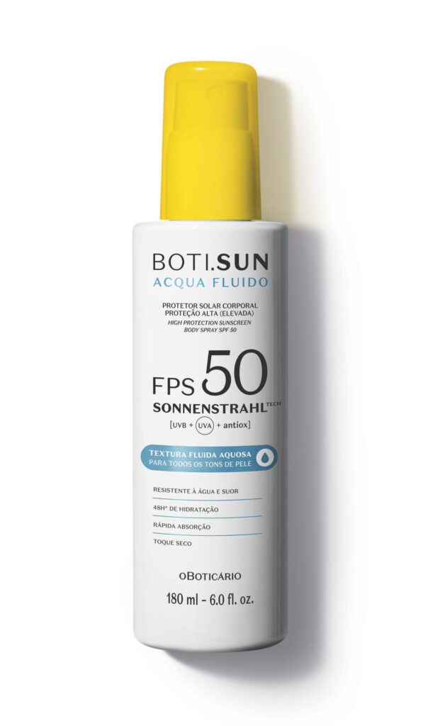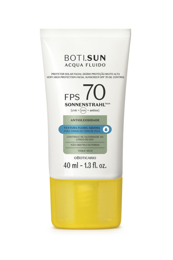 Já para minimizar os sinais de envelhecimento precoce causados pela exposição solar, o BOTI.SUN Aqua Fluido Protetor Facial Antissinais, também com opções de FPS 30 e 70, atua na preservação do colágeno, conferindo uma pele mais firme, com tom e textura mais uniformes.