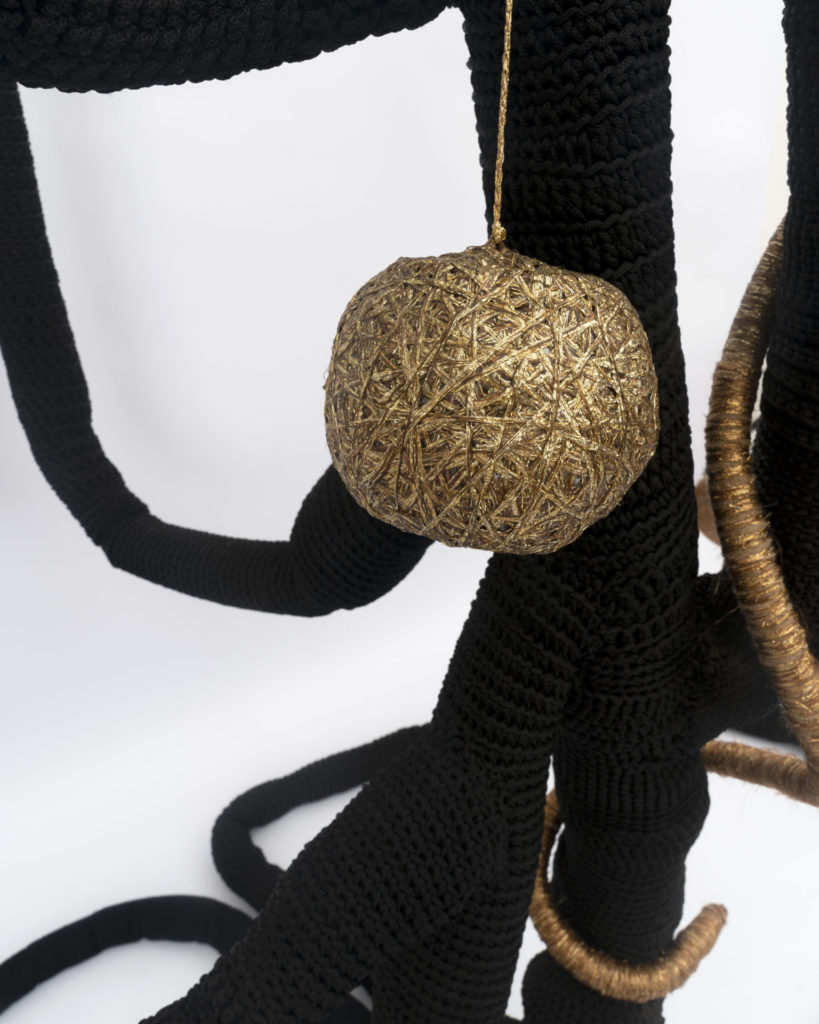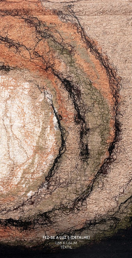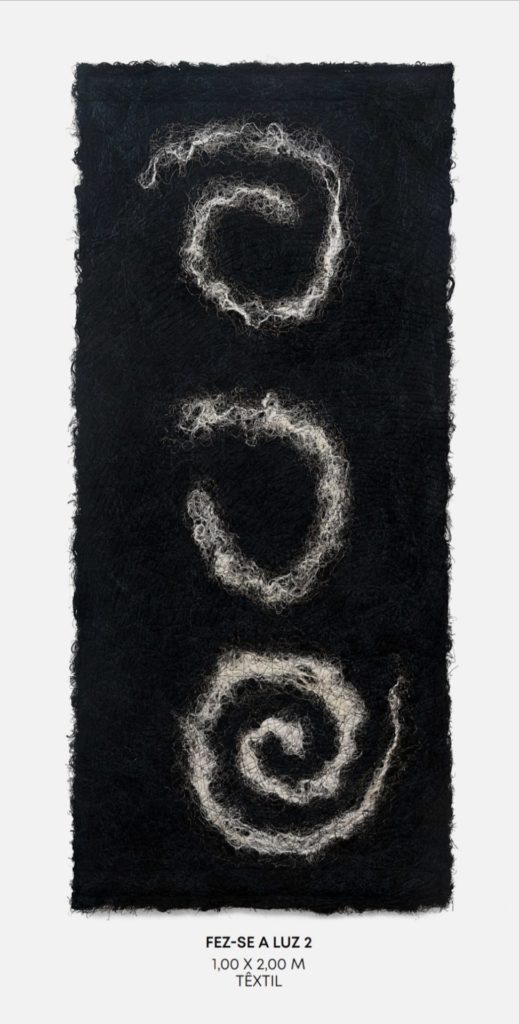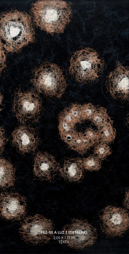 A partir disso, sua jornada começou na busca do que seria o “Faça-se a Luz” e de que maneira poderia representar isso plasticamente. Apropriando-se da plasticidade dos fios têxteis e sua versatilidade, a artista os sobrepõem de modo poético sobre fundos escuros, que remetem à escuridão da galáxia e seu rompimento com feixes de luzes.