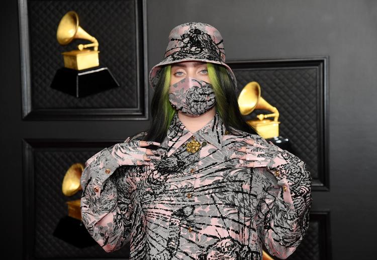 As máscaras não foram deixadas de lado, prova disso foi que, elas não só apareceram, mas também se destacaram ao serem escolhidas minuciosamente pelos stylists dos artistas. Billie Eilish e o irmão, Finneas, que também vestiram looks da Gucci, usaram máscaras que davam continuidade ao visual, fossem elas abstratamente estampada ou completamente monocromática.