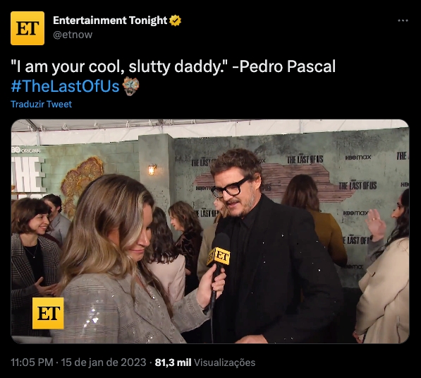 O astro da série “The Last of Us”, Pedro Pascal, ao ser entrevistado durante a estréia da HBO respondeu a repórter: “I’m your cool slutty daddy” na tradução, seria algo como “eu sou o papai maneiro e safado”. O termo ousado gerou um grande burburinho entre mulheres e até mesmo homens, comentando que desejavam o ator como seu Sugar Daddy.
