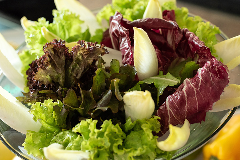 Salada verde da casa cortesia do Chef: folhas verdes, tomate confitado e redução de balsâmico.