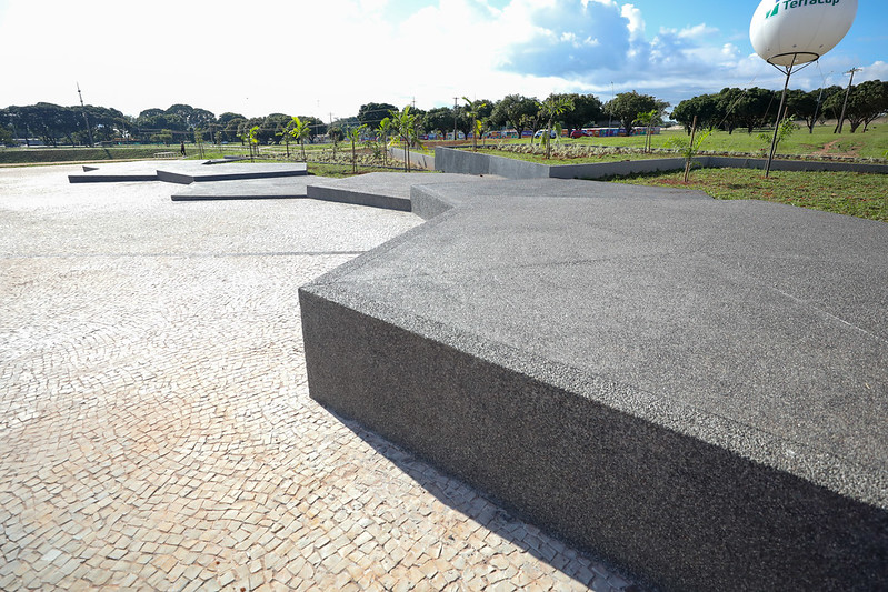 Pisos em pedras portuguesas, bancos em concreto, paisagismo com mudas de árvores, 1,1 km de ciclovia e 1,6 mil m² de calçadas tornam o Parque Internacional da Paz um lugar para contemplar e desfrutar do mais novo cartão-postal de Brasília.