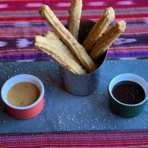 São 6 unidades dos famosos churros, (daqueles vendidos nas feiras mexicanas) acompanhados de doce de leite e chocolate. Já o pastel de três leches, (presença obrigatória nas festas de aniversários no México) é uma opção individual de bolo de massa branca com calda de leite evaporado, creme de leite e leite condensado coberto com doce de leite e chantilly.