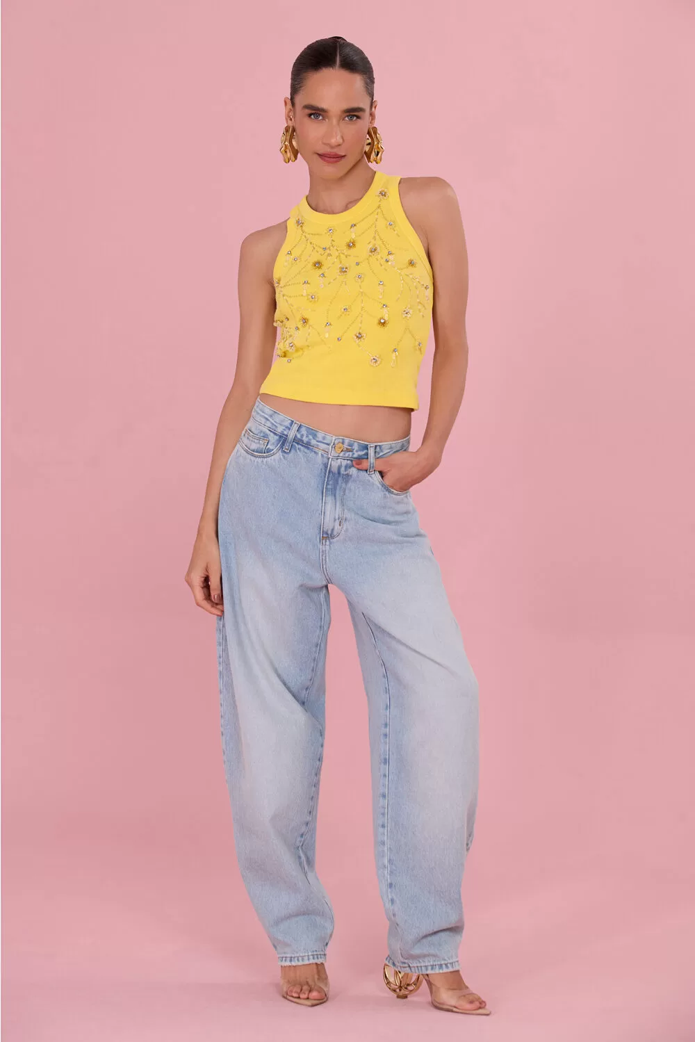 Entre os destaques, calças e regatas bordadas ressignificam peças do cotidiano por meio do trabalho manual, enquanto materiais como denim, malharias e poliamida com elastano ganham novas leituras. O resultado é uma coleção versátil, que transita com naturalidade entre o resort, o urbano e o casual sofisticado, propondo uma forma de torcer que vai além do momento esportivo.