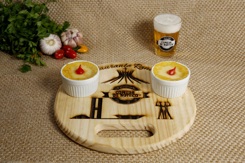 Escondidinho do Rancho – jiló com linguiça, gratinado com queijo parmesão, servido em uma tábua de madeira com gravação dos monumentos de Brasília.