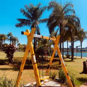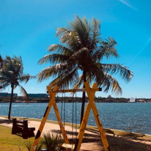 O céu inigualável de Brasília e uma das mais belas vistas do Lago Paranoá são o cenário do photo point com balanço, novidade do Pontão para os seus visitantes a partir deste mês de maio. Sucesso em vários países, o novo espaço instagramável do complexo de gastronomia e entretenimento do Lago Sul já está aberto ao público e traz a frase “Uma pausa para o balanço” e as cores azul e amarelo, em um trabalho gráfico da designer gráfica, Sammy Medeiros.