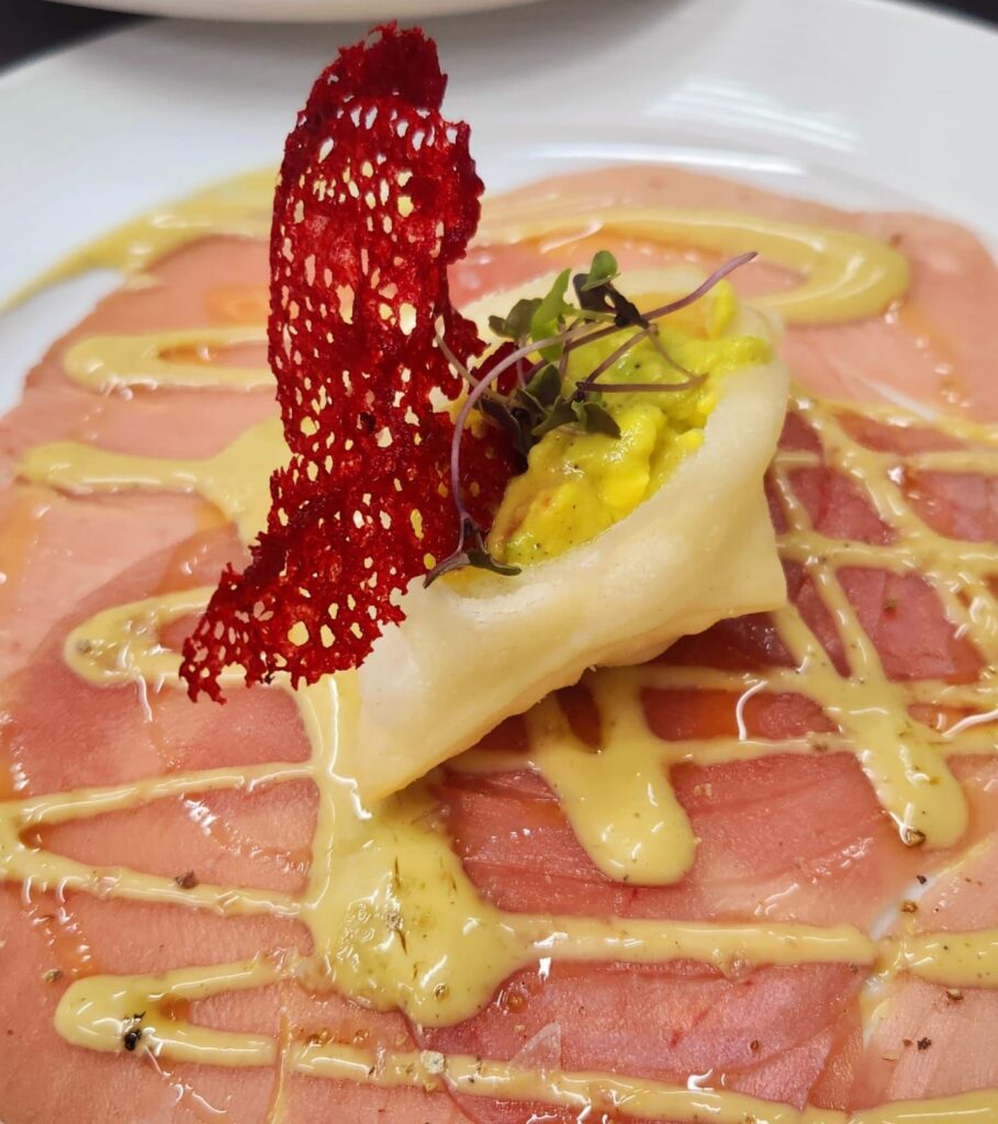 Como antipasto, a opção é o Carpaccio Di Tonno Con Gnocco Fritto e Polpa Di Granchio, um carpaccio de atum vermelho, aioli de wasabi e nhoque frito, recheado de guacamole e carne de caranguejo. O escolhido para harmonização perfeita do prato é o brasiliense Canindé colheita de inverno Ercoara rosé syrah 2022.