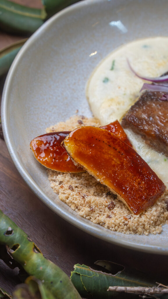 Os pratos principais também se destacam pela utilização de ingredientes locais. Exemplo disso é o Risoto de Limão com Camu Camu e Peixe da Temporada (R$ 68,00), que combina o toque cítrico do limão com camu camu, uma fruta amazônica. O Cupim 6h com Pirão de Queijo Goiano (R$ 68,00) é servido com farofa de baru e banana caramelizada. O Risoto de Missô com Cogumelos (R$ 60,00), opção para o público vegetariano, traz um toque umami cogumelos juba de leão à provençal.