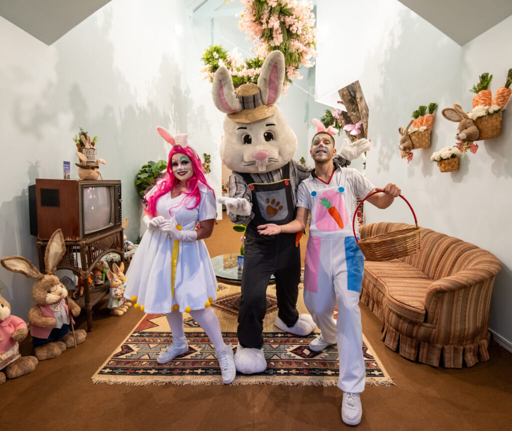 Equipada com vários ambientes temáticos e instagramáveis — como sala de TV e de jantar, cozinha, loja de souvenirs com itens temáticos e loja da Bacio di Latte — a interativa Toca do Coelho promete transportar toda a família para o mundo encantado do personagem. Ao lado das suas ajudantes, o Sr. Coelho estará disponível para tirar fotos todos os dias, das 15h às 21h, até o dia 31 de março. Do lado de fora, o público encontrará jardins com plantas variadas, tocas com os vizinhos do Sr. Coelho, carrossel, snacks e oficina de ovos de chocolate.