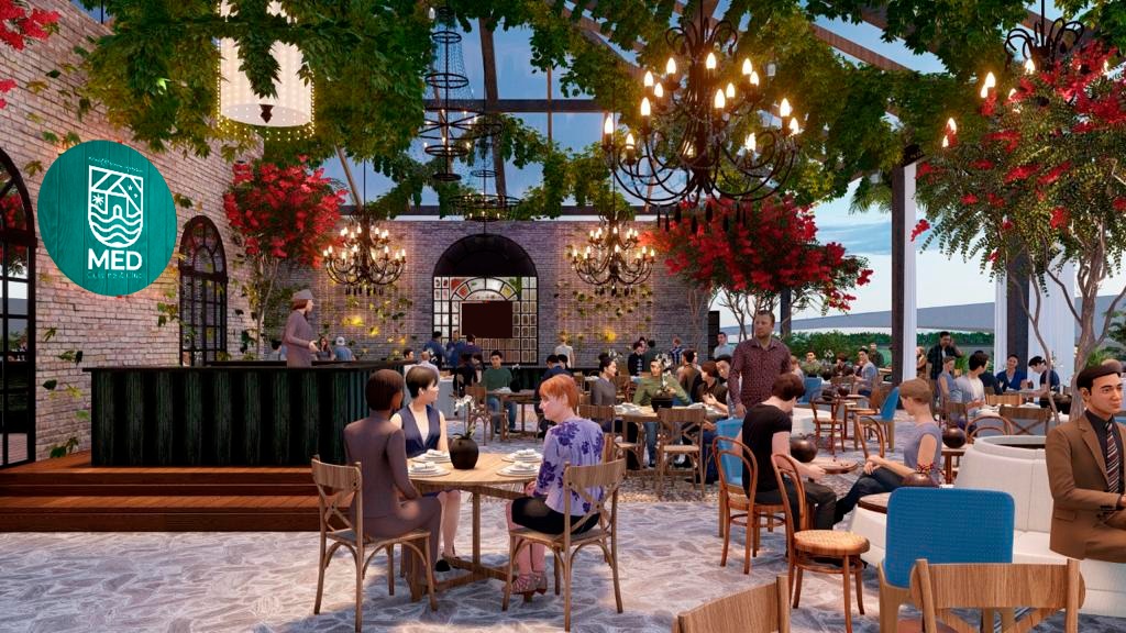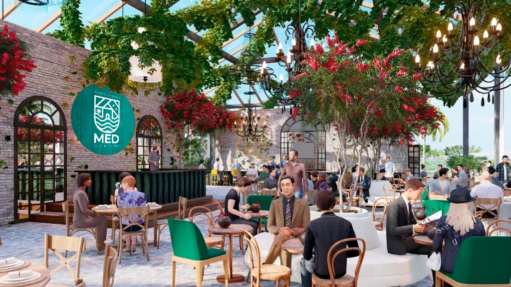 Com capacidade para 300 lugares e projeto desenvolvido pelos arquitetos Gustavo Gois e Marcella Teixeira, cada espaço interno e externo do Med Cuisine & Club busca trazer a riqueza arquitetônica Mediterrânea dos diferentes países em que são banhados pelo mar. Materiais naturais como pedra e vime transmitem frescor e leveza. Tons terrosos estão presentes em colunas e arcos arredondados. Ainda, uma vasta ornamentação.