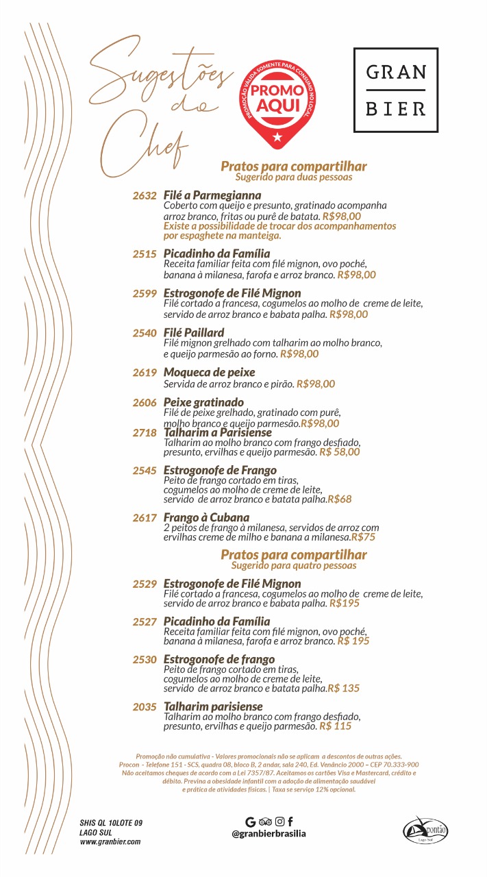 O Gran Bier, às margens do Lago Paranoá, no Pontão do Lago Sul, está com novidades no seu menu. De segunda-feira a segunda-feira, no almoço e no jantar, a casa está com as “Sugestões do Chef”. São pratos para compartilhar (duas ou quatro pessoas) a preços promocionais para os clientes que consumirem de forma presencial. A casa está funcionando das 11h às 21h.