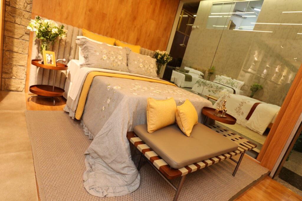 Nas camas da Casa Barroco, parceira da Primavera Casa, jogos em finos tecidos, com variedades de fios que colecionam memórias afetivas. Sensações que se estendem para a linha de banho, com as conhecidas e aclamadas toalhas em algodão egípcio e baby skin, que promovem experiências únicas. Para complementar o ambiente, tapetes da Galpão – Casa em Movimento.