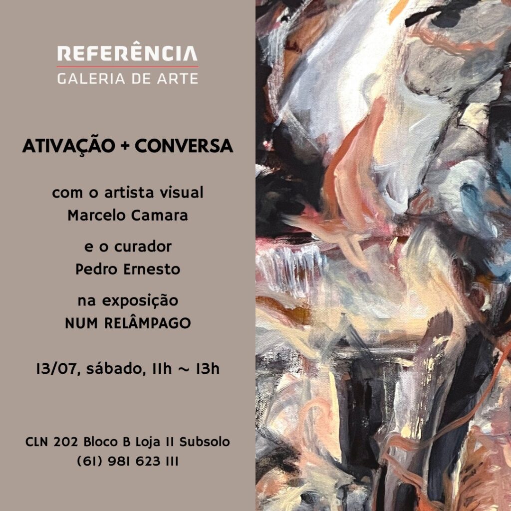 Como parte da programação da mostra “Num relâmpago”, de Marcelo Camara, a Referência Galeria de Arte realiza, no próximo sábado (13), das 11h às 13h, a Ativação + Conversa com o artista visual e o curador Pedro Ernesto. A proposta do evento consiste na oferta e realização de uma ou mais atividades experimentais propostas pelo artista da exposição em cartaz.