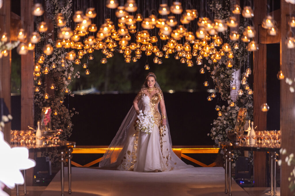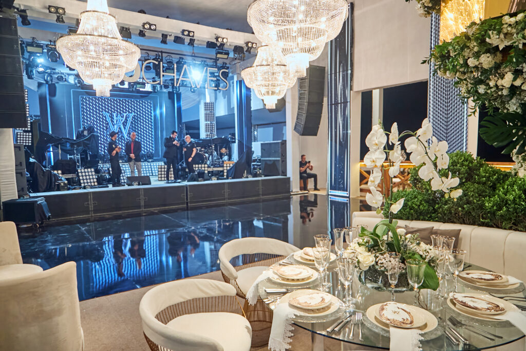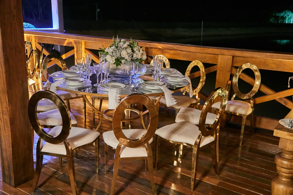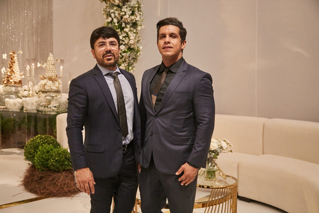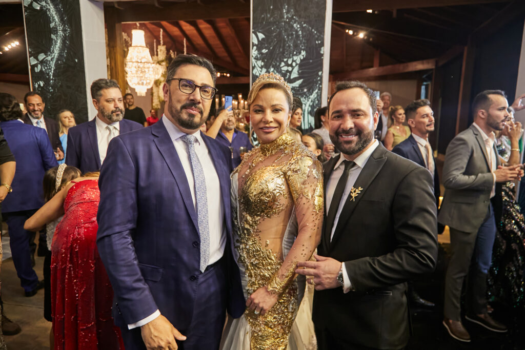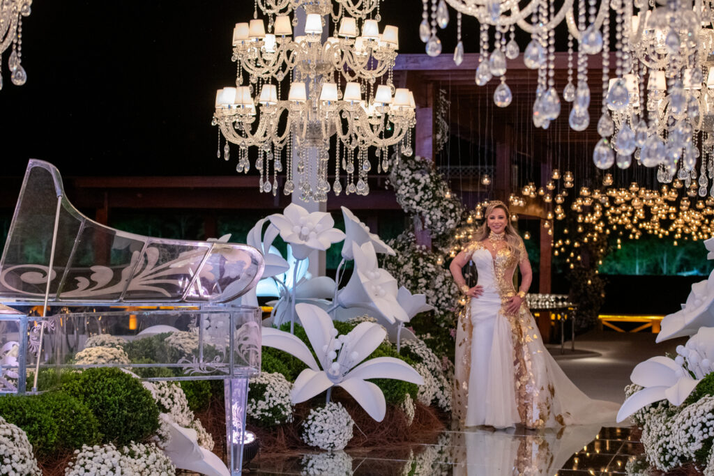 Depois de casarem em Dubai em uma cerimônia luxuosa há dois anos, Wanderson e Kelly resolveram renovar os votos junto dos amigos na fazenda próxima a capital federal. E a festa, para cerca de 300 convidados, não ficou devendo nada em termos de luxo e diversão. O convite, uma criação da Paper Chic, já anunciava que seria um grande acontecimento. O profissional Kaká Fagundes começou a trabalhar na idealização da festa por cinco meses e construiu uma estrutura de 2 mil e 500 metros quadrados, dividido em um espaço para a cerimônia e outro para a festa. Com uma rica decoração, os espaços foram ornados com 26 lustres e cortinas de cristal espalhados pelos ambientes, uma cascata de led, 800 vasos de orquídeas, 12 mil botões de rosa e várias flores naturais nobres, além de mil velas para compor a ambientação.