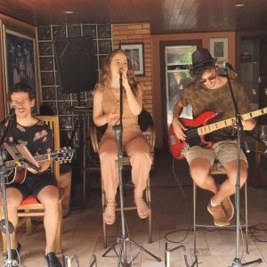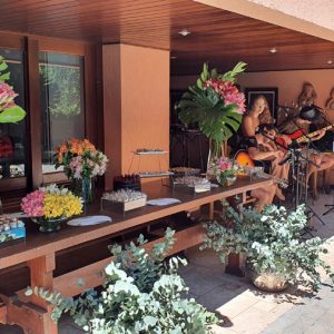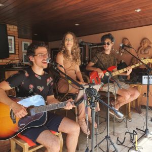 Todos chegaram pontuais para juntos brindarem a surpresa. Assim que Thiago chegou na área externa da piscina, às 14h, a banda Vemares composta por Verena Bello, Marcus Lopes, Pedro Jean e Daniel, começou a cantar “Parabéns” juntamente com todos.