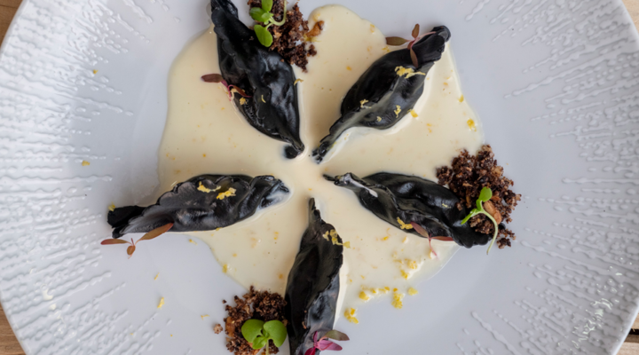 Principal: Agnollotti de polvo “in nero”, crocante de baru e jabuticaba e creme de limão siciliano