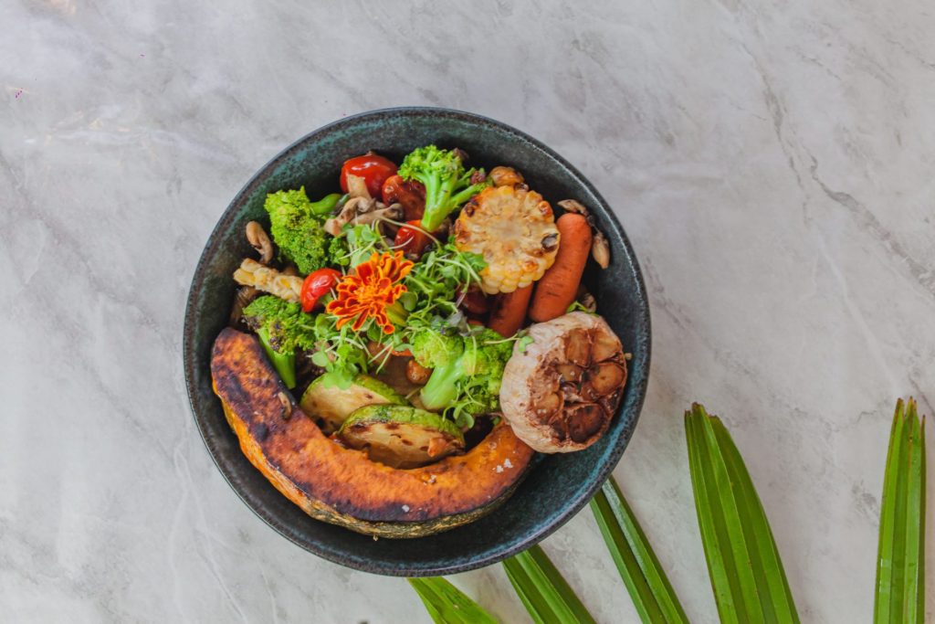 Vegetais da horta na wok com for de sal e cogumelos ou Sobrecoxa de frango Korin® assada ao pesto de manjericão e purê de batatas