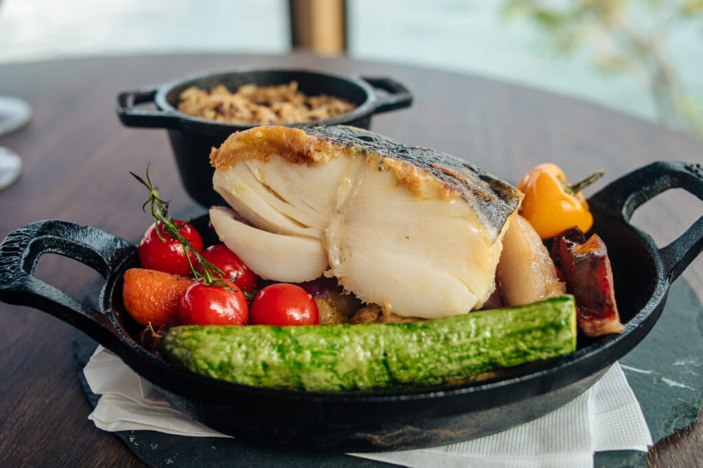 Enquanto nos pratos principais, mais surpresas, como a combinação de Duo de lombos defumados: lombos de bacalhau e de porco grelhados, servidos com legumes confitados, acompanhado de arroz de cogumelos porcini, para duas pessoas.