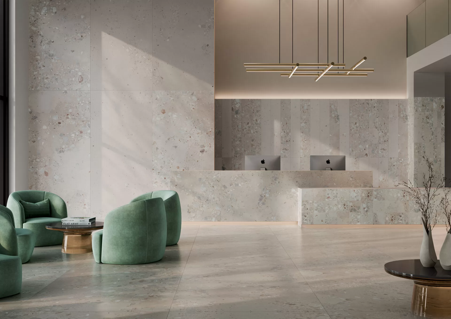 Entre os lançamentos estão as séries Granato, que revisita o clássico terrazzo italiano com efeito carving e diferentes granulometrias, e Lumina, inspirada na estética das rochas retroiluminadas, com veios em tons âmbar, dourado e cobre. A coleção também apresenta a Série Nogal, que traduz a aparência da madeira nobre em porcelanato de alta performance, e a Série Zeno, com visual cimentício e estética urbana em tons neutros. Os produtos exploram diferentes dimensões, incluindo superformatos, e contam com recursos tecnológicos como o acabamento Soft Tec, que amplia a segurança e a versatilidade de aplicação em áreas internas.