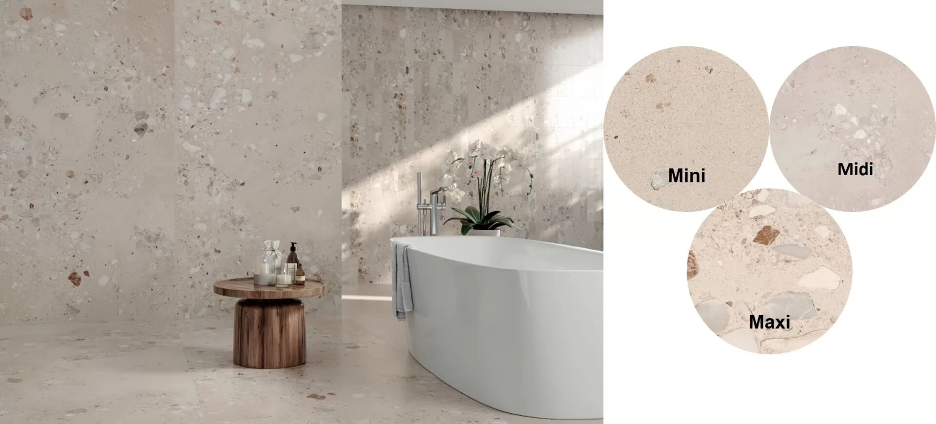 A Série Granato reinterpreta o clássico terrazzo italiano sob um olhar contemporâneo, valorizando a beleza das imperfeições com o efeito carving que combina acabamento com brilho suave e detalhes em baixo-relevo para valorizar a granulosidade dos seixos, com seus três tamanhos de estampas: mini, midi e maxi | Foto: divulgação Roca Cerámica