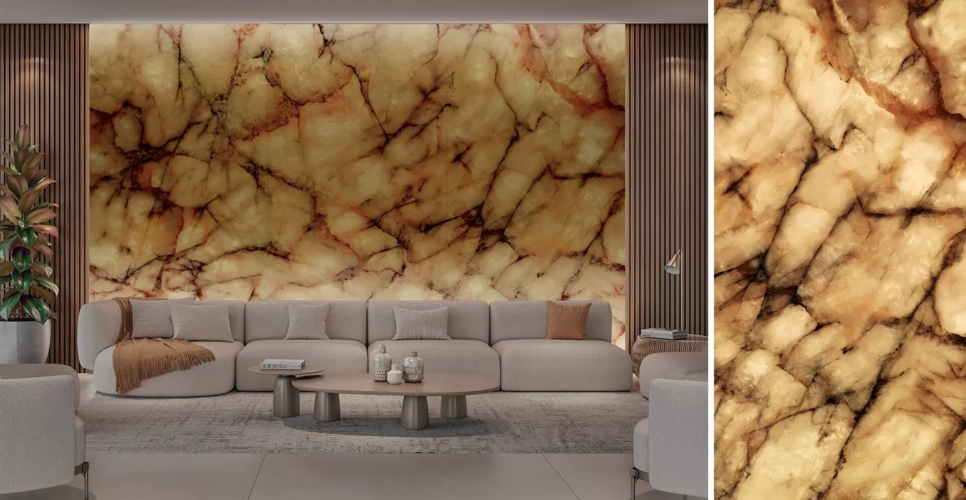 A magnitude da série Lumina, da Roca Cerámica, é apresentado no Superformato 160×320 cm, impressão em alta definição e acabamento premium Micro Crystal. São três faces com design End Match |Foto: divulgação Roca Cerámica