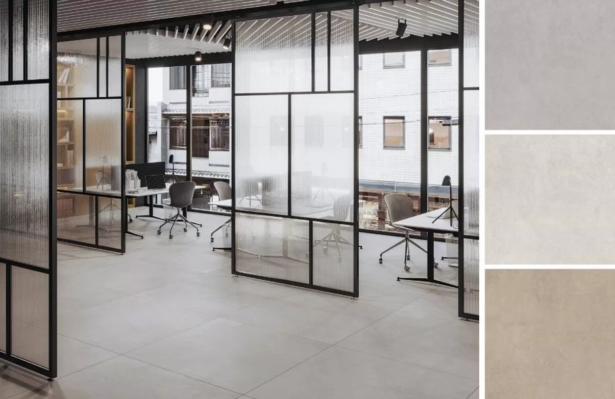 Ampliando o leque de tamanhos, os tons Gray, Greige e Off White da Série Concrete ganham o formato 90 x 90 cm nos acabamentos Mate e antideslizante ABS | Fotos: Divulgação Roca Cerámica