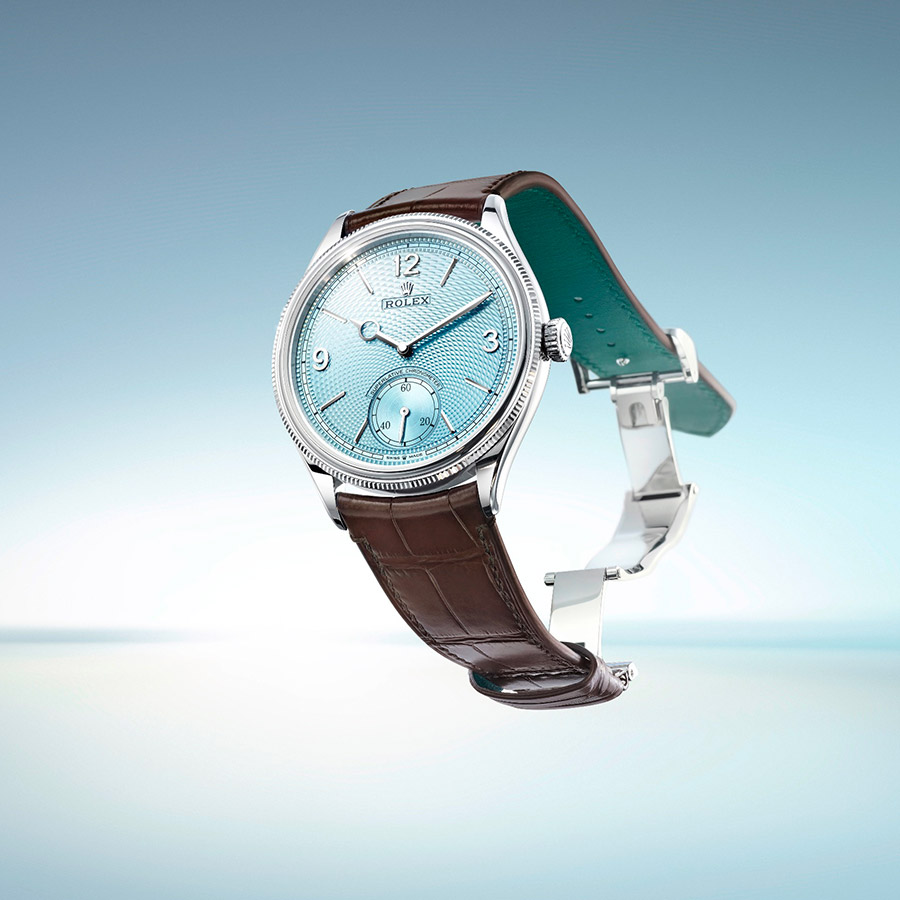 Elegante e sofisticado, o Perpetual 1908 está disponível em platina 950, com um mostrador azul glacial apresentando um motivo grão de arroz trabalhado em guilhochê.