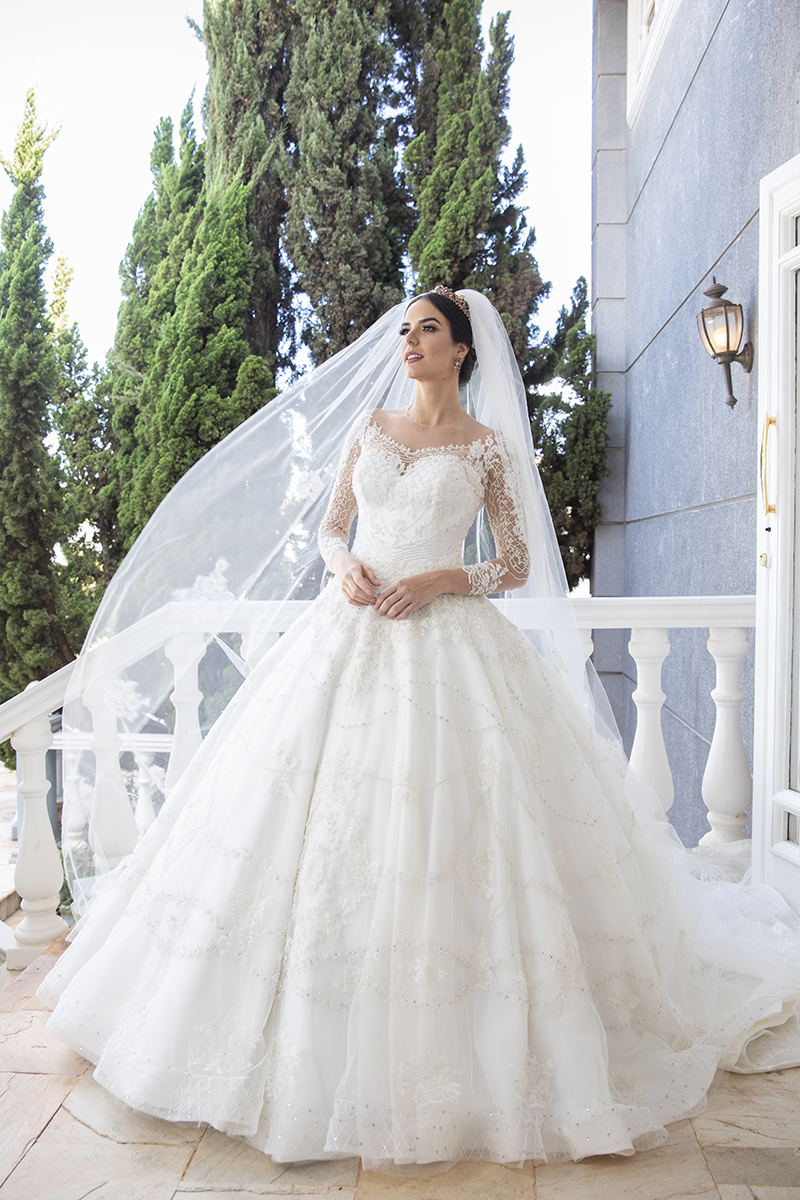 Entre os vestidos têm muitos que fazem o estilo princesa e são bem volumosos, mas têm também os modelos sereias com silhuetas slim, mas todos têm algo especial, até os lisos, que geralmente são mais minimalistas, na coleção Royale eles vêm com drapeados ou golas imponentes.