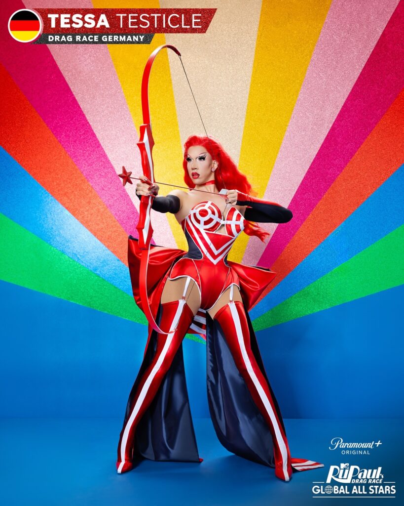 Tessa Testicle, natural da Basileia, Suíça, é conhecida por suas performances de dublê e dublagens lendárias. O nome drag de Tessa originou-se de um incidente de torção testicular durante sua primeira apresentação, em 2016. Sofrendo bullying na escola, ela encontrou aceitação no universo drag depois de descobrir RuPaul’s Drag Race. Estudante de design de moda, ela criou todos os seus looks para a Drag Race Alemanha, masclando glamour com exploração de identidade de gênero, surpreendendo constantemente seu público.