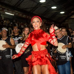 A apresentadora apostou em uma fantasia nada básica. Enquanto os membros da escola usavam a camisa preto e branco da mesma, ela se jogou em uma produção monocromática vermelha. O visual contou com um top liso com adereço com franjas volumosas no pescoço, caindo até o fim do sutiã. Para combinar, usou as mesmas franjas volumosas na parte de baixo, com uma proposta supercavada. Sem errar no look em ensaios, ela usou uma luva de amarração. Nos pés, um salto plataforma preto com as mesmas franjas para ornar. Deixando o cabelo solto, Sabrina Sato elegeu apenas uma tiara vermelha trançada aliada a uma maquiagem bem intensa com delineador marcado.