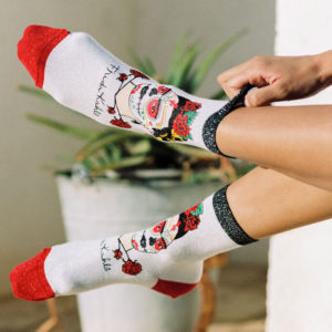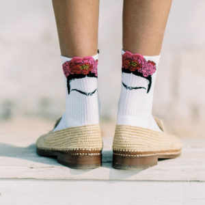 O rosto de Frida também aparece nos modelos da Calzedonia, como o usado por Sabrina. Meias curtas em um estilo mais pop e coloridas feitas em algodão trazem a irreverência de Frida para os pés.