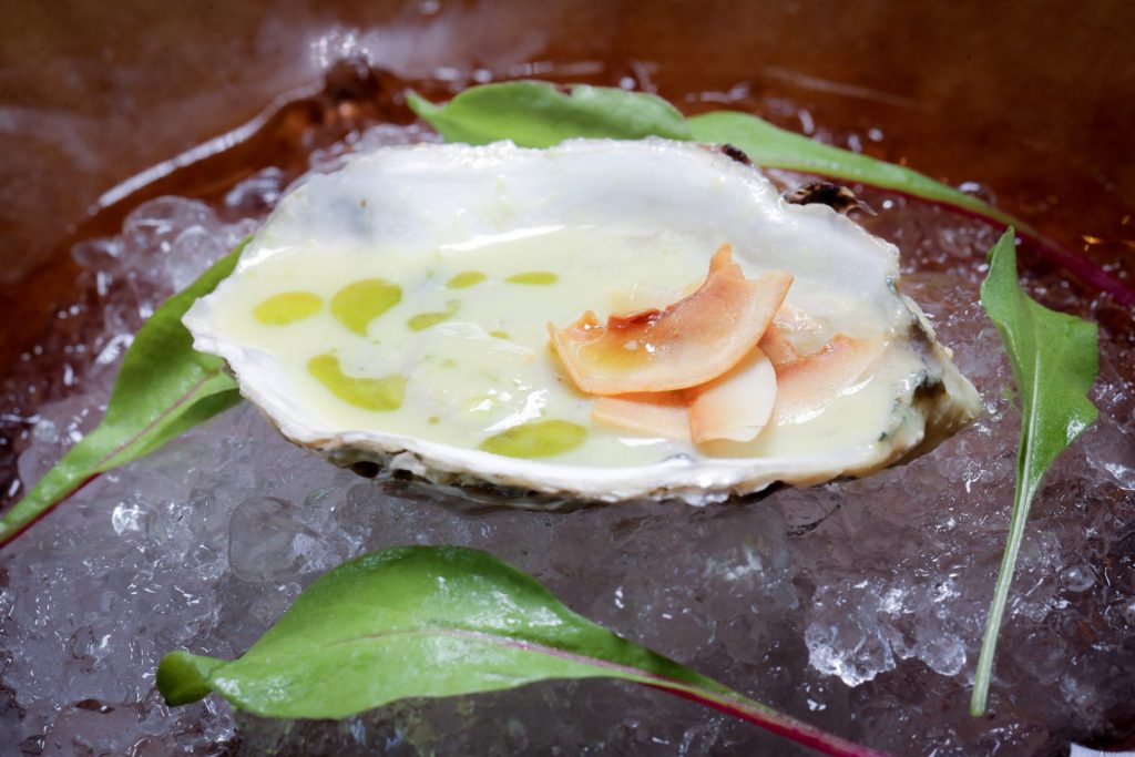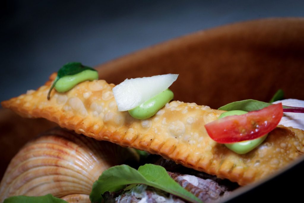 O drinque Sagrado Mar, um dos mais pedidos da casa, dá às boas-vindas ao comensal, que tem também à disposição no Passo 1, o couvert com pão artesanal elaborado na cozinha do restaurante, acompanhado de azeites e pastas. O Passo 2 traz Mini pastel de camarão, marguerita e aioli de manjericão. Para harmonizar, Valdemiz Brut, mesmo rótulo que acompanha também o Passo 3: Ostras frescas com molho de curry, amendoim e lâminas de coco dourado.