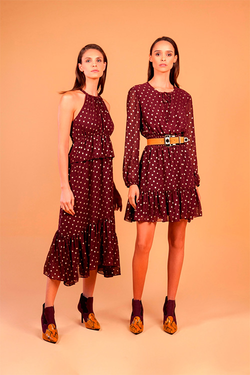 As peças da coleção receberam tecidos encorpados como veludo cotelê, sarja, jeans, couro ecológico, tweed, linho, neoprene e lurex, além dos fluídos: chiffon, crepe, jersey, viscose e tricoline. Blazers, calças e coletes de alfaiataria, camisaria, tricôs e top cropped ganharam destaque na temporada Outono-Inverno.