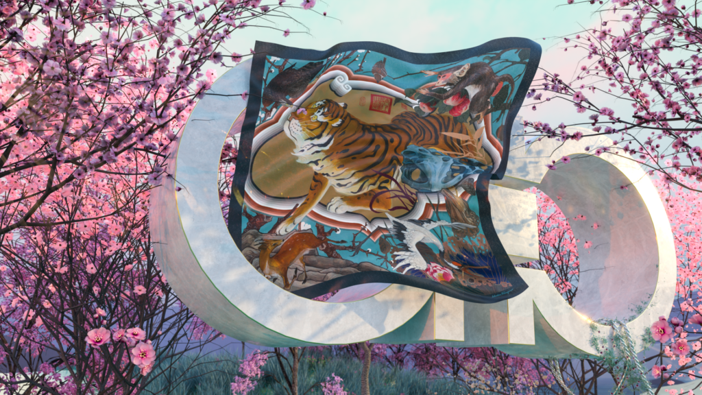 Inspirado pelas tradicionais pinturas Chinesas, a estampa traz o tigre que simboliza paixão, ousadia, auspiciosidade e segurança na cultura Chinesa. O tigre brinca com outras criaturas selvagens, uma garça, águia, veado e macaco no clássico jardim chinês coberto por pedras, plantas e flores, apresentando uma alegre e vibrante cena de renovação.