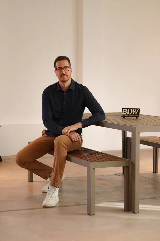A nova coleção traz mesas e bancos com formas geométricas que resgatam a memória afetiva dos primeiros apartamentos da capital federal, conhecidos por seus pisos de taco de madeira. “A ideia foi trazer esse elemento tão característico dos lares brasilienses para o mobiliário, usando tanto madeira quanto alumínio, em peças que combinam estética e memória”, explica o designer Danilo Vale.