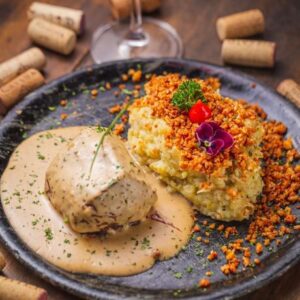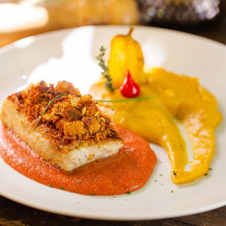 • Bem Brasil: Robalo sobre mousseline de goiaba com crocante de abacaxi com bacon e purê de banana da terra.
