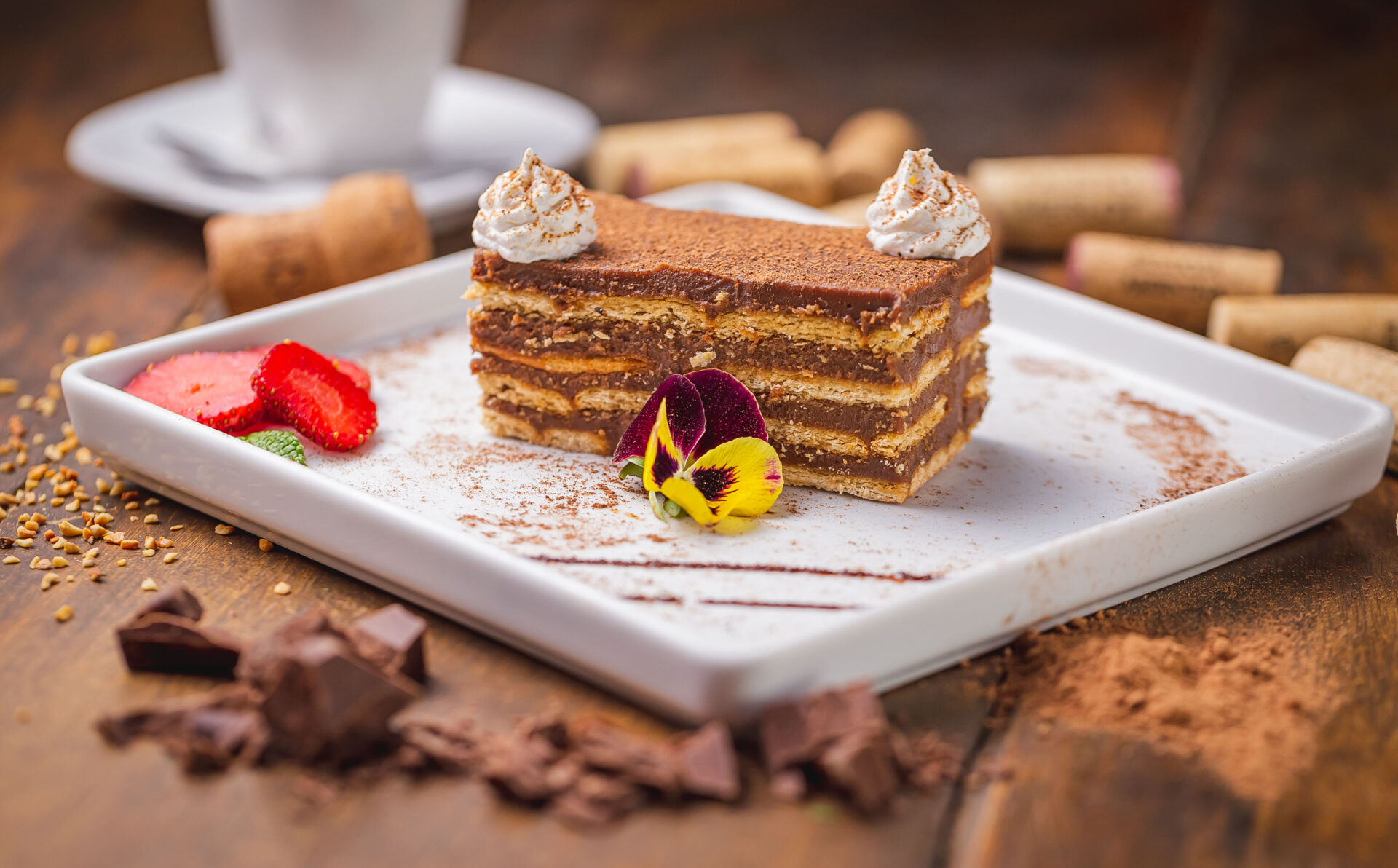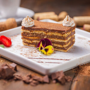 • Petit de Torta de Café: Gelada, com chocolate meio amargo, morango e creme de café.