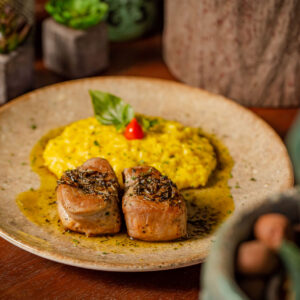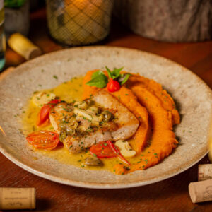 Para as opções de pratos principais, o Filet de Pargo grelhado ao molho de laranja com limão Siciliano, champignon e alcaparra, acompanha purê de cenoura, o Escalope de Mignon suíno ao molho de ervas com arroz cremoso de tangerina e champignon e o Escalope de mignon ao molho de queijo servido com fettuccine ao creme de espinafre e gruyére.