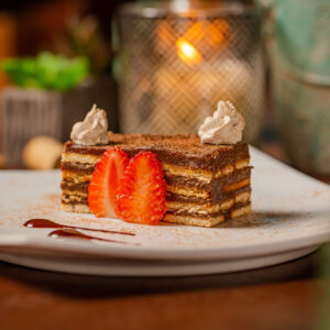 A sobremesa também é um momento especial da refeição nas casas Santé. É possível escolher entre a Pera ao caramelo de limão com canela ou a Petit torta de café, receita especial de torta da casa com café.