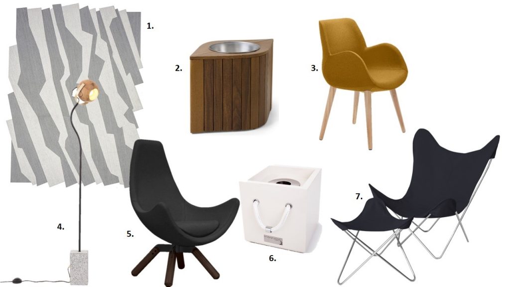 1. Tapete Cidade Revolution®, design Plataforma 4 para a By Kamy; 2. Mesa geleira Lumiar, design de Lattoog para a DonaFlor Mobília; 3. Cadeira Woma, com base em madeira maciça, da Sittz;; 4.Luminária de piso Umbu, design de Atelier Bam para a Bertolucci; 5.Poltrona Lazy, design de Lucas Carareto para a F.Way; 6.Lareira portátil Eco 55, com base em porcelanato, da Ecofireplaces; 7.Poltrona e banco Butterfly, com capa em lonita preta, da Futon Company;