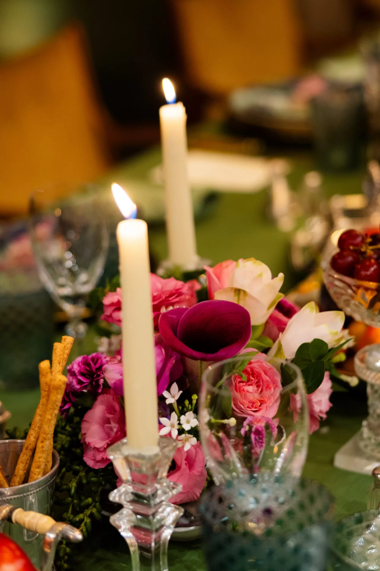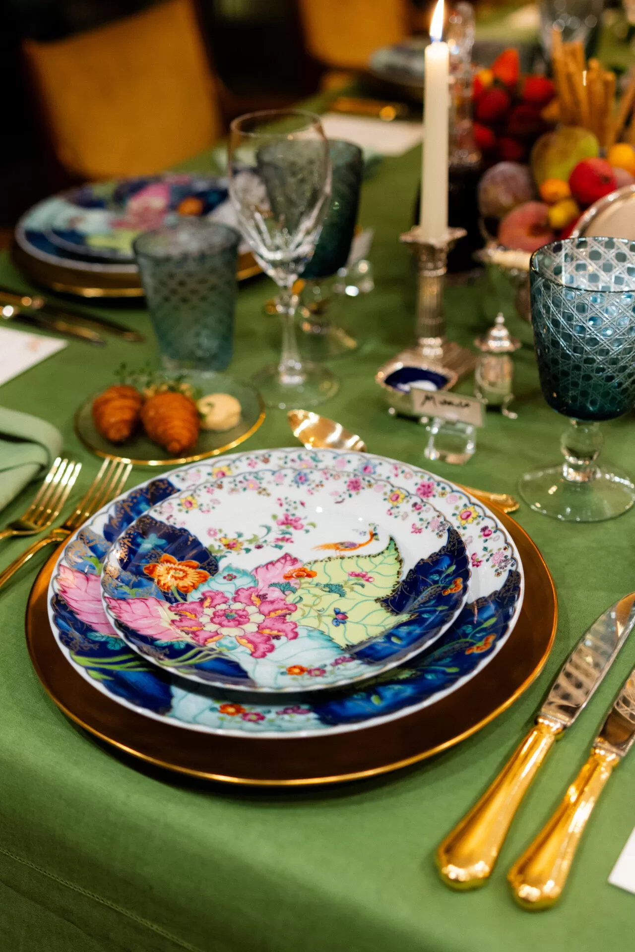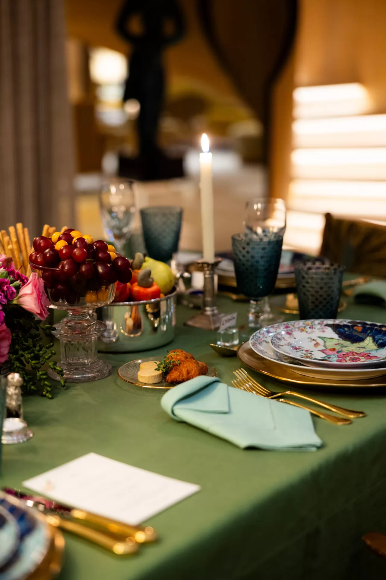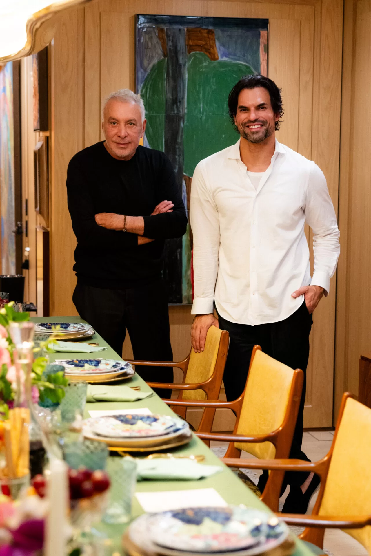 A ambientação refletia a assinatura inconfundível da dupla. A mesa, marcada por uma paleta intensa e sofisticada, combinava arranjos florais em tons vibrantes com louças de estampas expressivas, criando uma composição de forte identidade visual. As cores conversavam com a estética do apartamento, conhecido pela presença de obras de arte e por uma curadoria que imprime personalidade em cada detalhe. A iluminação, cuidadosamente pensada, valorizava tanto as peças nas paredes quanto a apresentação dos pratos, reforçando a atmosfera acolhedora e elegante.