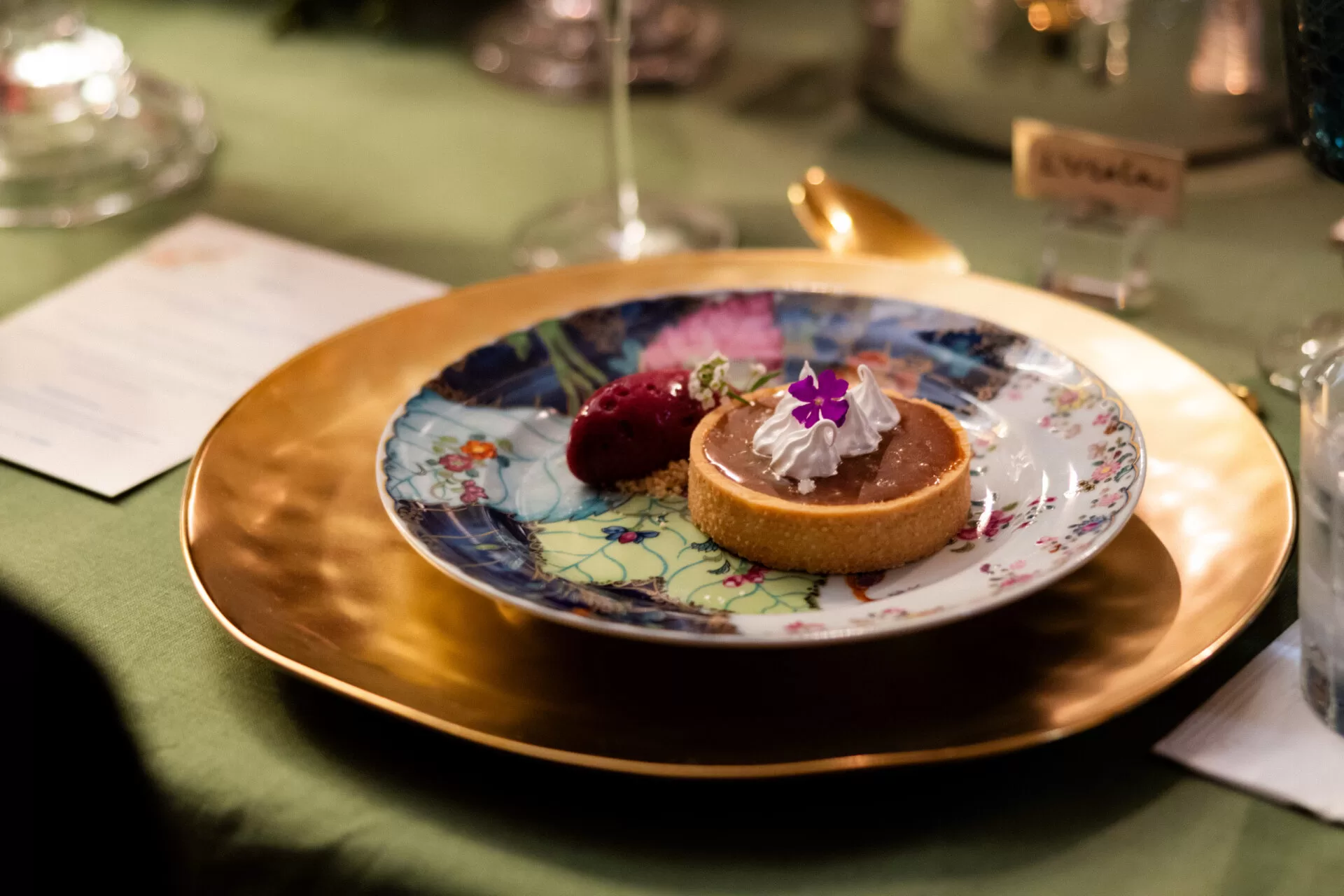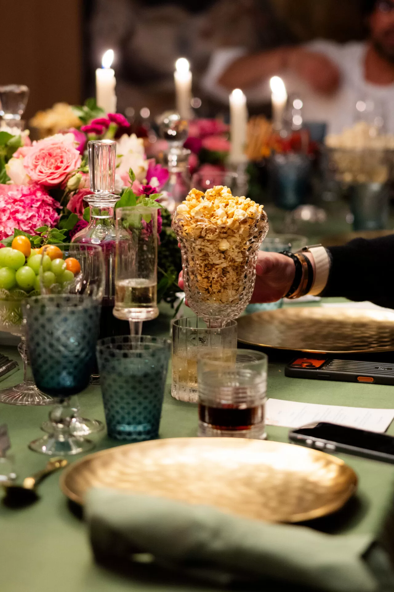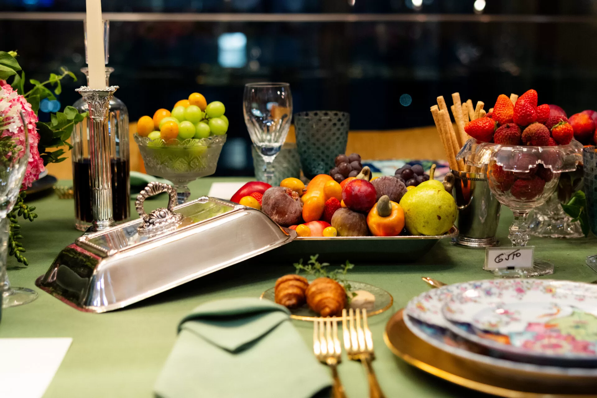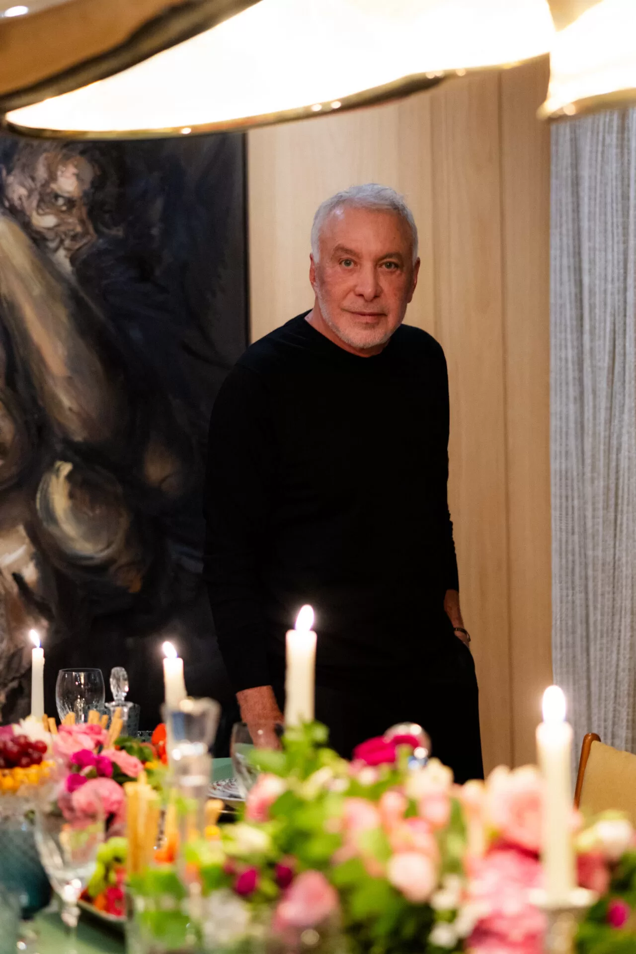 A ambientação refletia a assinatura inconfundível da dupla. A mesa, marcada por uma paleta intensa e sofisticada, combinava arranjos florais em tons vibrantes com louças de estampas expressivas, criando uma composição de forte identidade visual. As cores conversavam com a estética do apartamento, conhecido pela presença de obras de arte e por uma curadoria que imprime personalidade em cada detalhe. A iluminação, cuidadosamente pensada, valorizava tanto as peças nas paredes quanto a apresentação dos pratos, reforçando a atmosfera acolhedora e elegante.