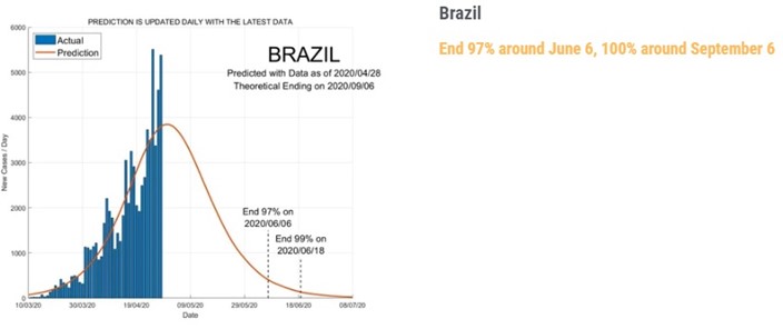 Já no Brasil, a covid-19 atingiria seu ápice em maio e teria uma redução considerável no número de afetados (97%) somente em 06 de junho. O contágio seria zerado somente em 06 de setembro.