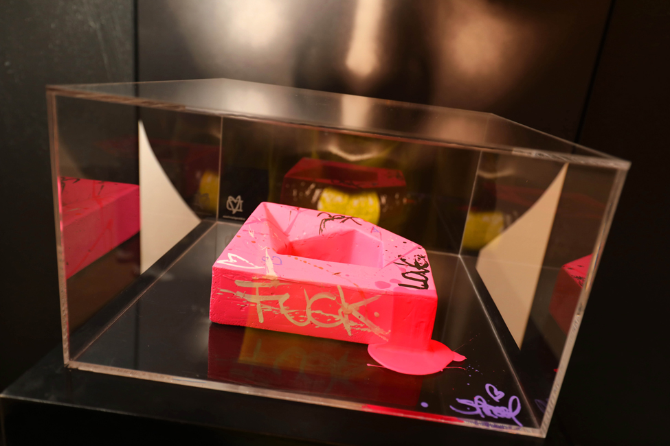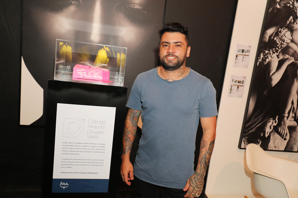 O artista plástico Douglas Viana também está presente na exposição em uma intervenção artística no cobogó Kina, que será vendido e terá sua renda doada a uma instituição beneficente parceira.