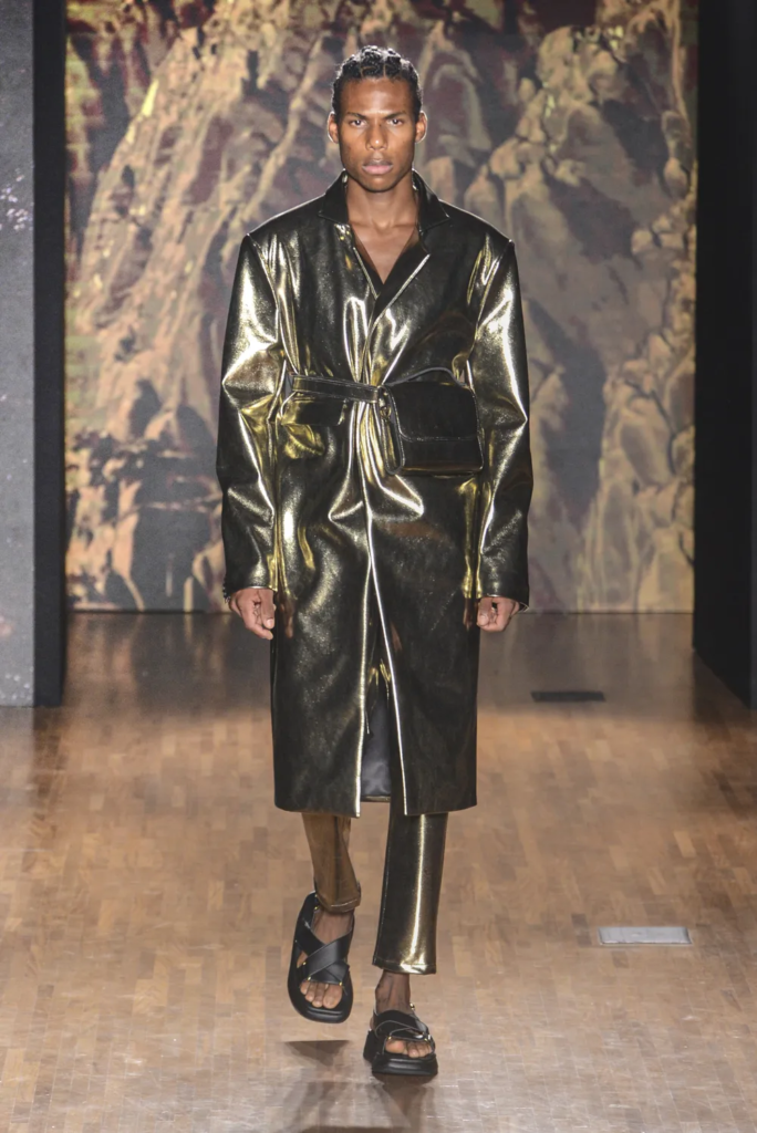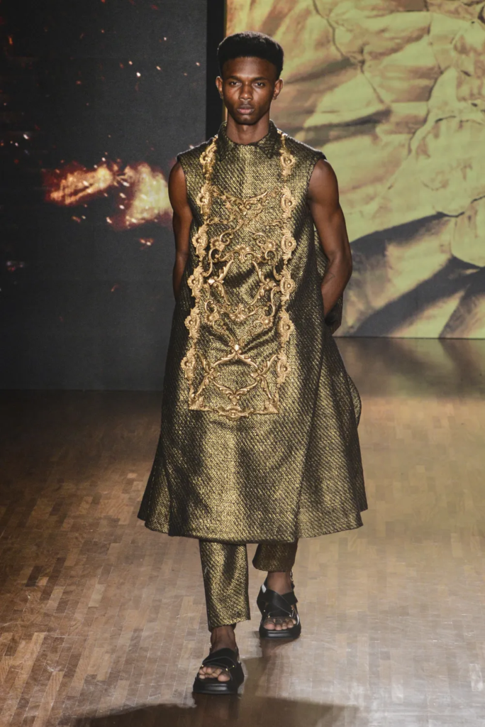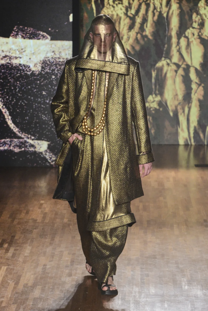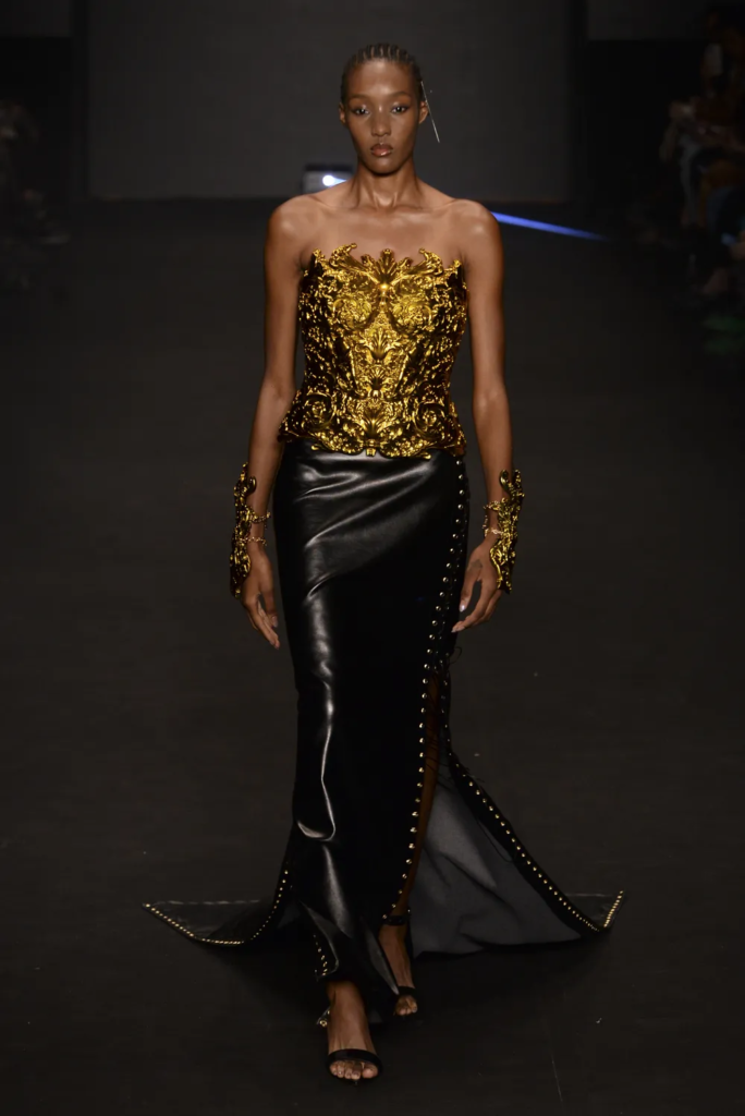 Na Patricia Viera, em vestidos de couro e conjuntos de calça e blazer. Na Artemisi, em body de metal e tops 3D prateados. No Joao Pimenta, o dourado ganhou looks completos de alfaiataria, enquanto Walerio Araujo apostou em suntuosos figurinos em tons de prata e dourado.