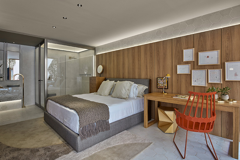 Os painéis, da Bontempo, de madeira Freijó e MDF se destacam pelo alinhamento, outro ponto focal do espaço, que traz uma sensação de organização visual. Já a iluminação foi pensada de forma solta para que o mobiliário possa ser mudado de acordo com a necessidade da moradora. No banheiro a escolha foi especial, uma tela tensionada dá a sensação uma claraboia, além do vidro inteligente que fica opaco quando a porta é fechada. O acionamento do vidro (CLX “Inteliglass) é feito pelo trinco da maçaneta, transformando de transparente para opaco. Uma floreira, que também funciona como a bancada, enfeita e alegra o ambiente.