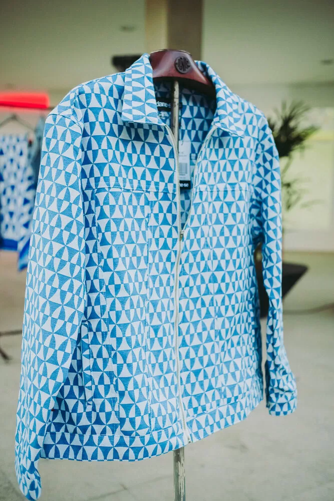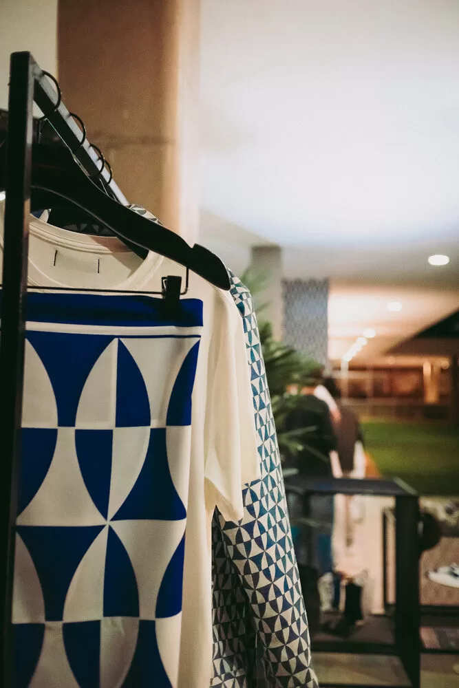 A nova coleção da Dane-se mergulha nesse universo simbólico, transformando em peças de roupa os ícones que marcam o hotel: a Rural Willys azul que repousa na entrada, como uma cápsula do tempo; a piscina oval, cartão-postal do projeto original; as esculturas de Darlan Rosa espalhadas pelos andares; e, claro, os inconfundíveis azulejos de Athos Bulcão, que revestem o edifício com cor, geometria e identidade.